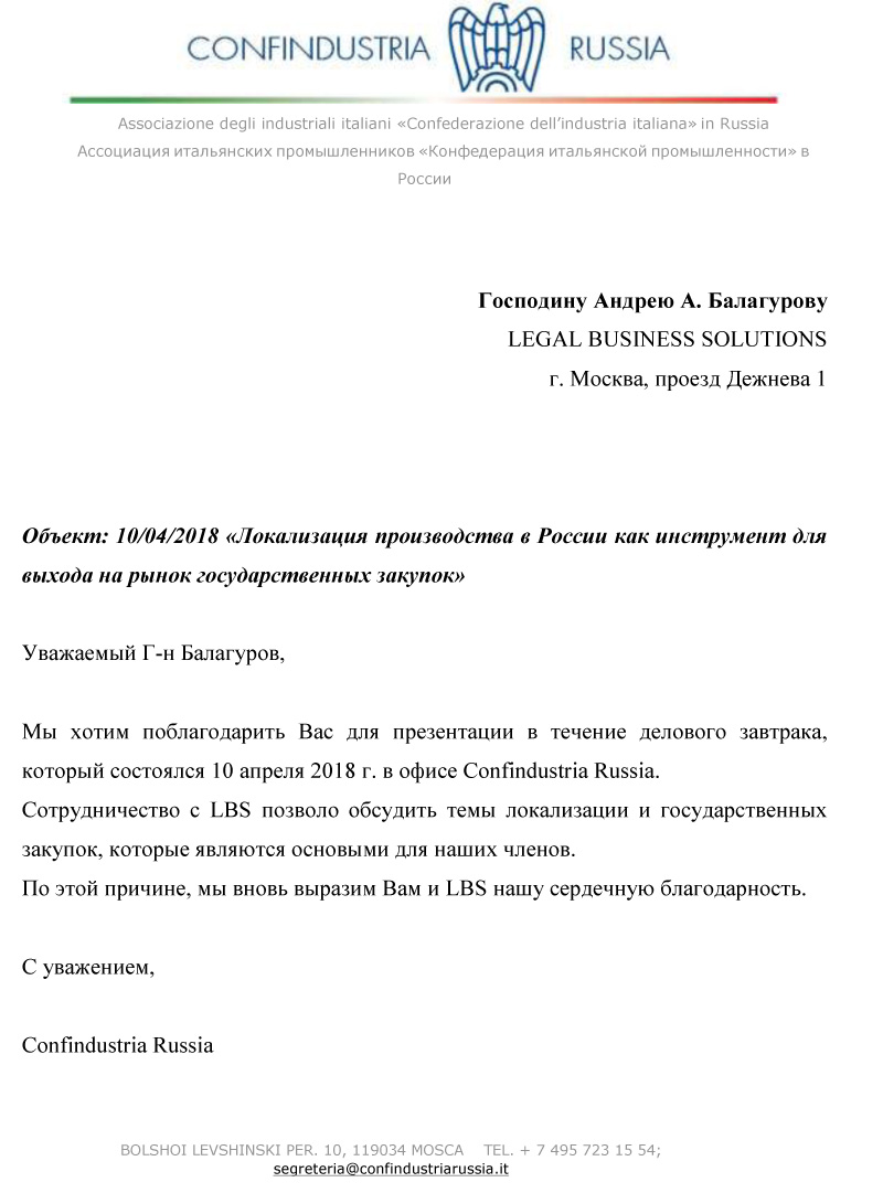 La Confederazione dell’industria italiana (Confindustria Russia) ringrazia il socio