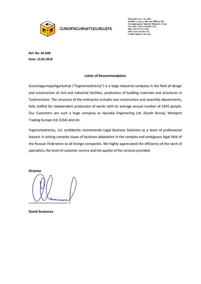 IP “Iugmontazhstroi” raccomanda a tutte le compagnie straniere il Centro Legale “ZakonnyiBiznes”, una squadra degli avvocati professionisti nell’ambito di risoluzione delle situazioni complicate dell’adattamento del business al complicato e ambiguo complesso normativo della Federazione Russa. “Abbiamo altamente apprezzato l’efficacia del lavoro dei professionisti, il livello di servizio clienti e la qualità dei servizi prestati.”