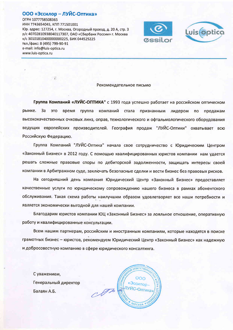 A partire dal 2012 lo Studio Legale Legal Business Solution presta i servizi legali alla “ESSILOR-LUIS-OPTICA” in settori seguenti: